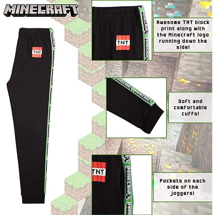 - MINECRAFT TRACKSUIT BOTTOMS --- A must-have for all Minecraft fans! These casual boys joggers with elastic waist are perfect as sport wear, tracksuit or to wear as loungewear when relaxing at home. Our fantastic tracksuit bottoms are also available in 2 different styles and are suitable for boys and teenagers from 5 to 14 years.
